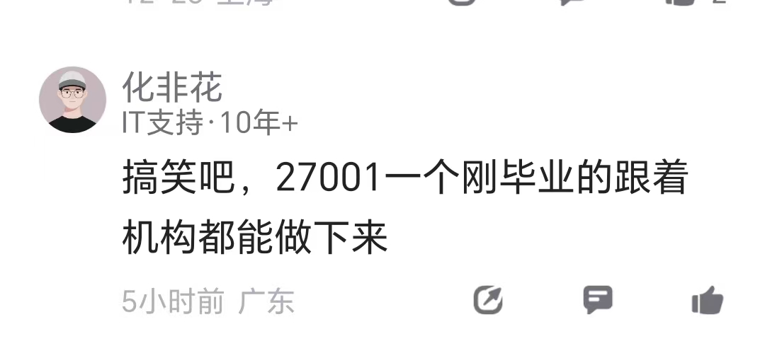 像以上图片这种言论,涉及到甲方和乙方。我们先来看甲方,倘若一个甲方安排一个刚毕业的职场新人去对接ISO/IEC 27001项目,那么相关的负责人对于信息安全,对于ISO/IEC 27001的认知和掌握程度是可想而知的,而最终结果,这种项目,最终都是以烂尾收场的。甲方企业得不到任何实质意义上的收益,纯粹是浪费甲方企业的时间和资源,而相关负责人只会把烂尾结果,重新包装一番,然后去忽悠甲方企业的老板。